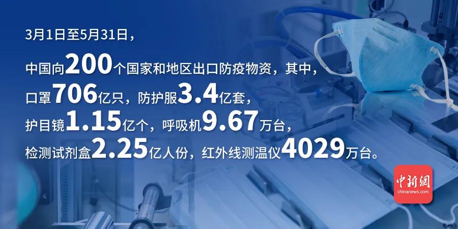 3月1日至5月31日,中國向200個國家和地區(qū)出口防疫物資,其中,口罩706億只,防護服3.4億套,護目鏡1.15億個,呼吸機9.67萬臺,檢測試劑盒2.25億人份,紅外線測溫儀4029萬臺,出口規(guī)模呈明顯增長態(tài)勢,有力支持了相關國家疫情防控。